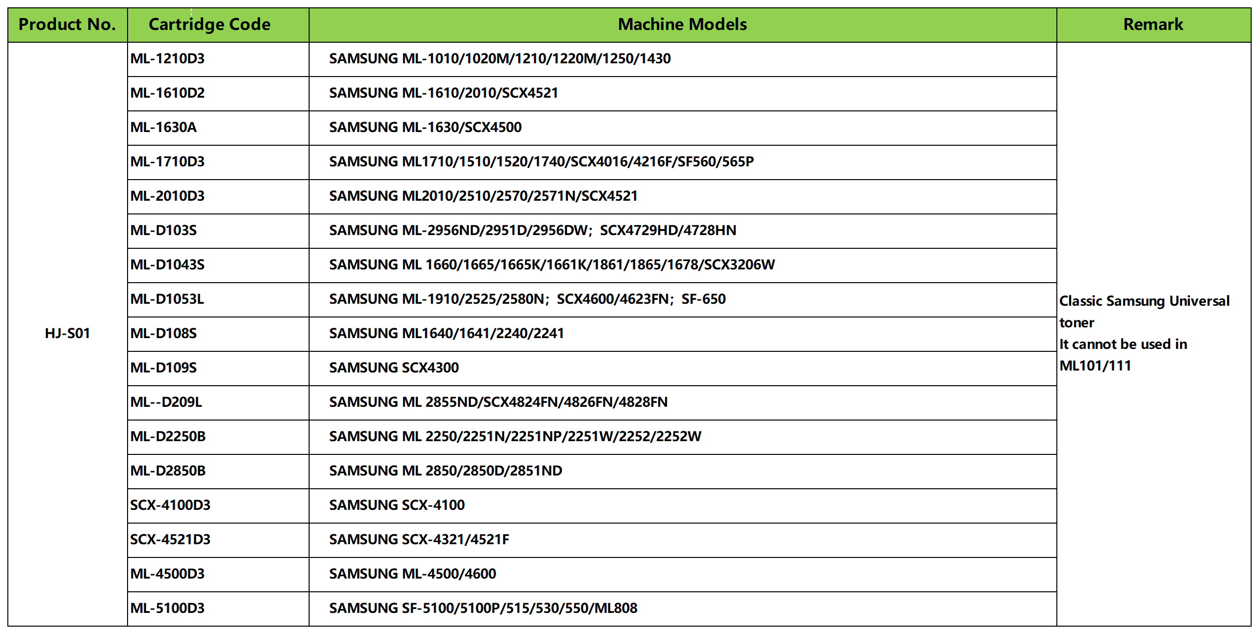 HJ-S01 foda ne na Samsung universal, wanda za'a iya amfani dashi akan dukkan samfuran Samsung banda na'urorin ML 101/111.